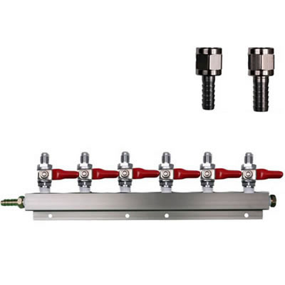 This allows you to split your CO2 line from one into six! Each with it's own controlled shut off valve. This air distributor has pre-drilled holes, so that you can mount it to the side of your refrigerator.